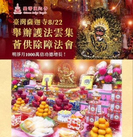 每月藏曆二十九日,為護法薈供日。縱使我們可能不會修護法供養的完整儀軌,但藉由參贊臺灣薩迦寺常住僧團每月舉辦的「護法雲集薈供除障法會」,一樣可以與護法結緣,結下將來深入學佛的法緣。