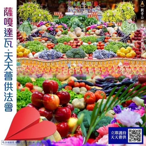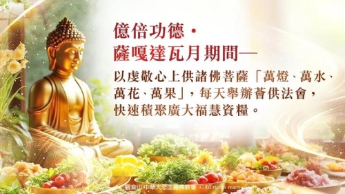 5月17日~6月15日欣逢億倍功德‧薩嘎達瓦月,觀音山舉辦「天天薈供法會」,邀請您在一年中最快速累積福德資糧的月份,連續一整個月,每日以清淨心、恭敬心、歡喜心來共同圓滿萬盞燈、萬杯水、萬朵花、萬顆果,上供諸佛菩薩、空行護法諸聖眾,為在世或往生者廣修供養、積聚善因,必招感不可思議果報。