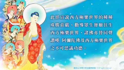 ⟡《佛說觀無量壽佛經》主要敘述佛陀應韋提希夫人所請,示現西方極樂淨土,進而為之廣說觀想念佛的十六觀行、往生淨土的淨業三福,以及九品往生等內容;又於十六觀中,第九「阿彌陀佛真身觀」是最重要的觀行,因此經名亦依之而立。此經闡述西方極樂世界的種種殊勝莊嚴,勸導眾生發願往生西方極樂世界,諸佛亦皆同聲讚嘆 阿彌陀佛及西方極樂世界之不可思議功德。
