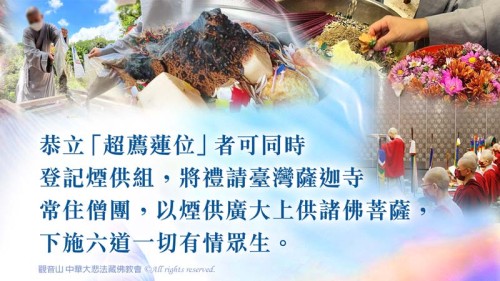 法會特別提供恭立「超薦蓮位」者,可同時登記煙供組,將禮請臺灣薩迦寺常住僧團,以煙供廣大上供諸佛菩薩,下施六道一切有情眾生,令大眾快速積聚福慧資糧,功德更圓滿增勝。